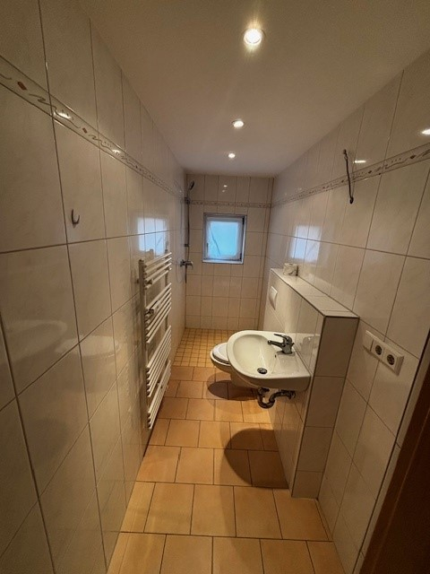 Das Badezimmer ist das absolute Highlight dieser Wohnung: hochwertig ausgebaut, mit modernen Bodenfliesen und einer bodengleichen, extra breiten Dusche über die gesamte Raumbreite – stilvoll abgetrennt durch eine elegante Glaswand.
