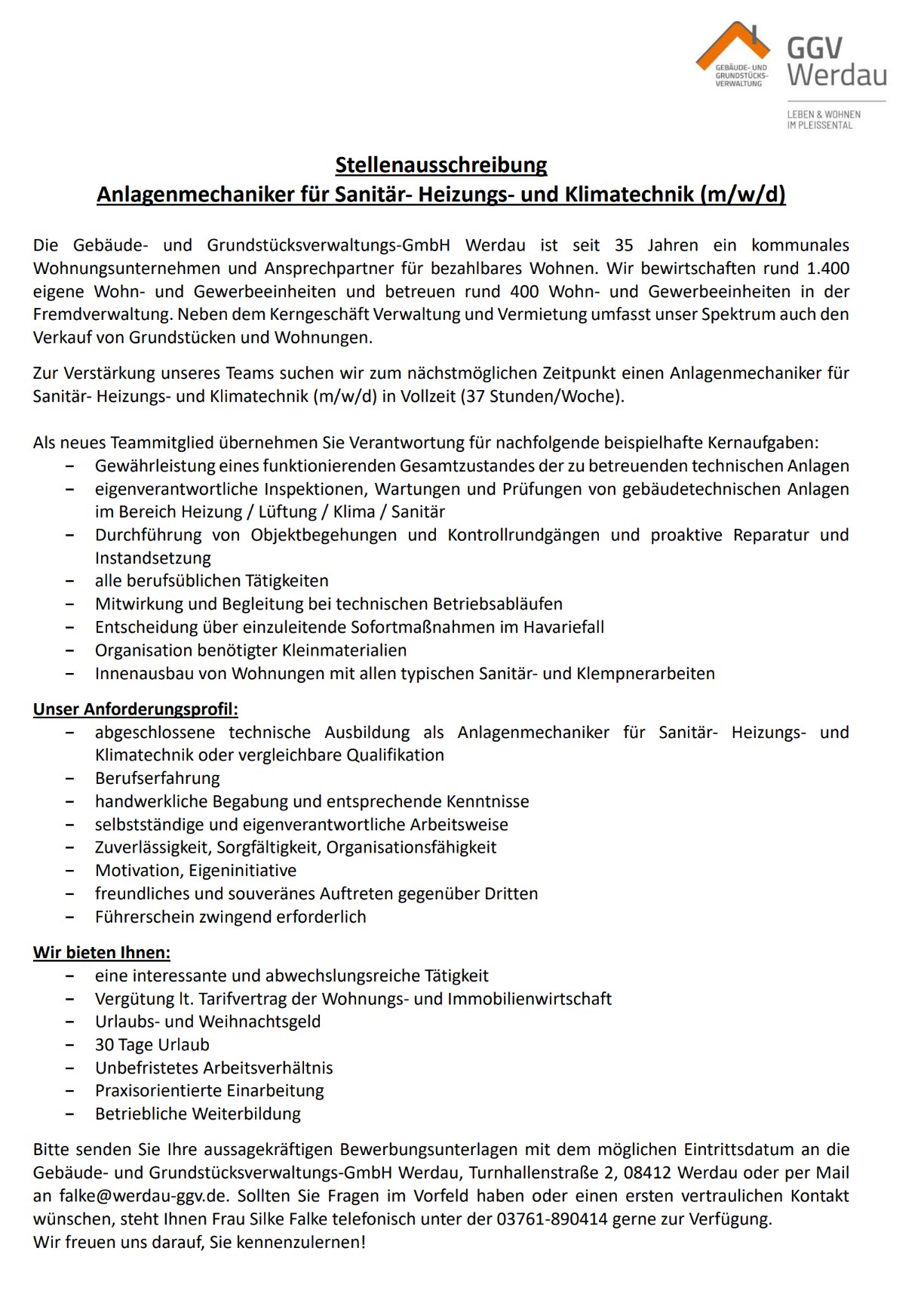 Senden Sie Ihre aussagekräftigen Bewerbungsunterlagen an die Gebäude- und Grundstücksverwaltungs-GmbH Werdau, Turnhallenstraße 2, 08412 Werdau oder per Mail an falke@werdau-ggv.de. Sollten Sie Fragen im Vorfeld haben oder einen ersten vertraulichen Kontakt wünschen, steht Ihnen Frau Silke Falke telefonisch unter der 03761-890414 gerne zur Verfügung.